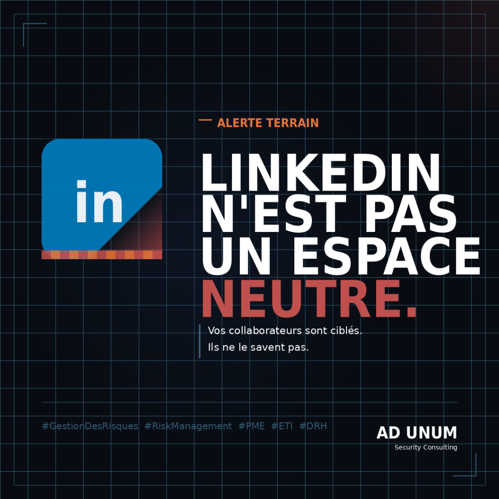 Les opérations de captation d’information via LinkedIn ne ciblent plus seulement les environnements institutionnels ou de défense. Les PME et ETI actives à l’international sont désormais exposées — et leurs collaborateurs n’ont généralement reçu aucune formation pour reconnaître ce type d’approche.